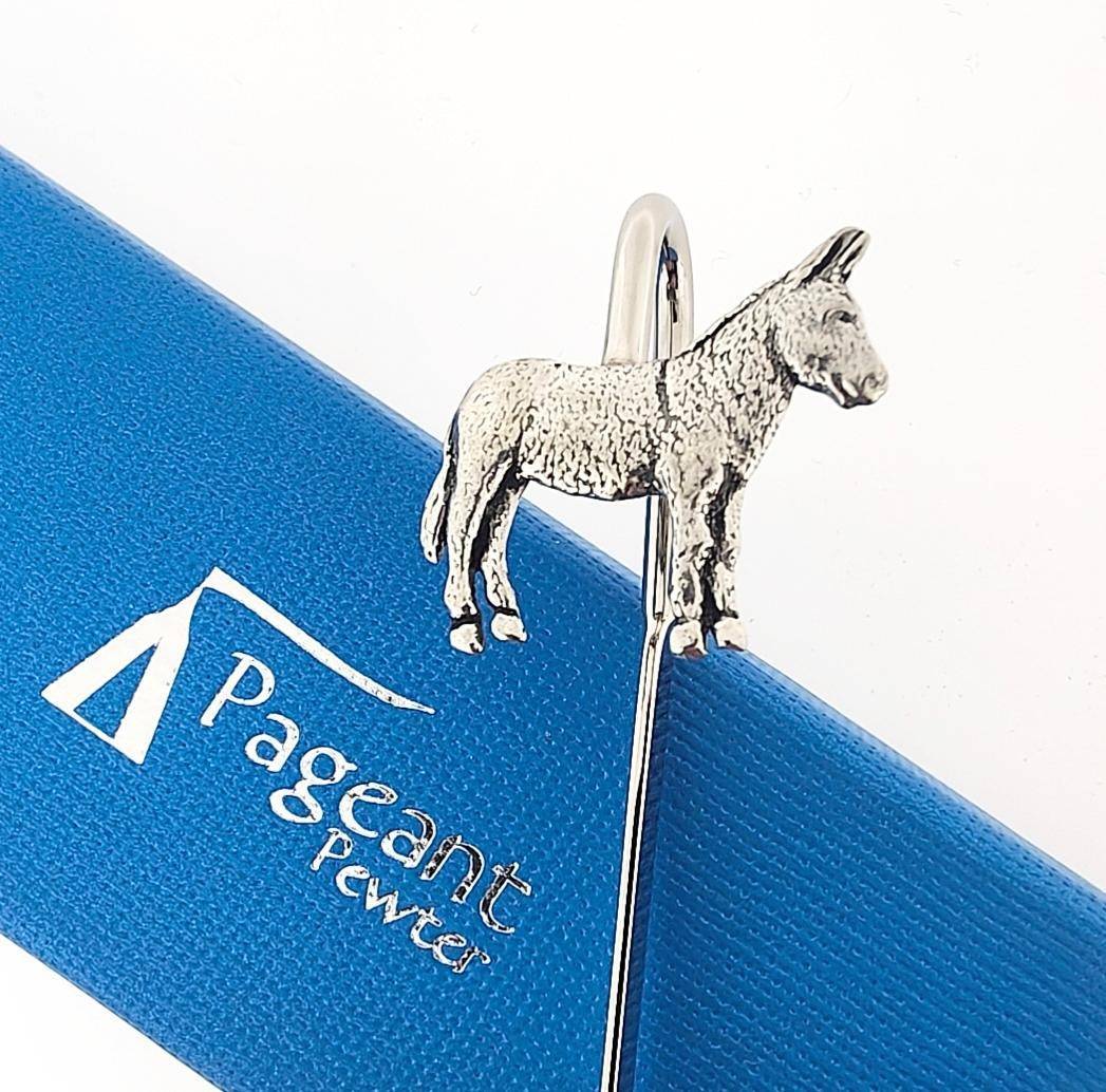 Our beautifully detailed Donkey Bookmark features a flattened stem that enables a page to be marked without risk of damaging the book. The motif is then elegantly presented on the spine of the book, and the book can be put back on the book shelf with the mark in place. Supplied complete with an attractive lidded box. The ideal gift for any riding enthusiast.